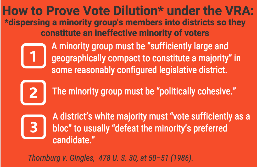 The State denied that race was a factor in District 12’s redesign, alleging that the motivation was purely political — to pack the district with Democrats, which is perfectly legal. In finding no error with the District Court’s required “sensitive inquiry” into all “circumstantial and direct evidence of intent,” SCOTUS upheld the finding of racial predominance. In coming to its conclusion, SCOTUS noted that population changes did not require resizing the district and that redrawing made drastic changes in the district’s racial composition. SCOTUS also pointed to public statements made by legislators showing their motivation for redrawing the district — that is, to create a “majority-minority” district, purportedly to comply with the VRA.