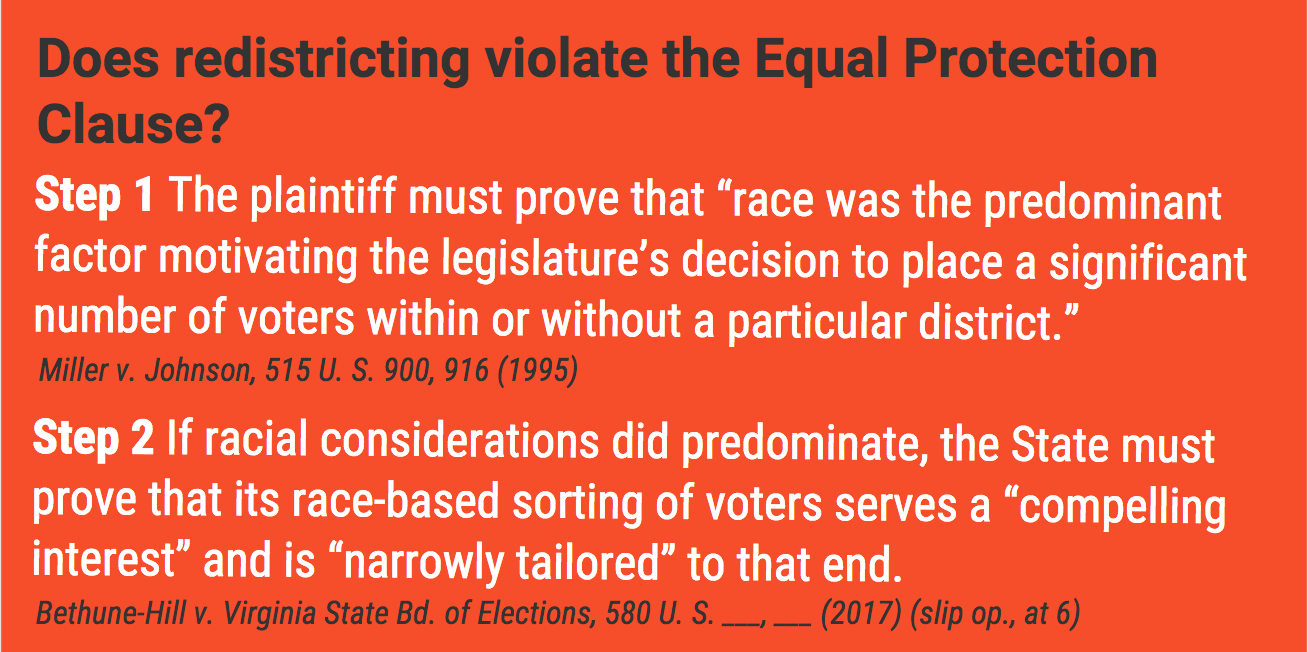 Applicable Law: The Equal Protection Clause prohibits a State, without sufficient justification, from “separat[ing] its citizens into different voting districts on the basis of race.” Miller v. Johnson, 515 U. S. 900, 911 (1995). When a voter sues state officials for drawing such race-based lines, judges apply a two-step analysis to determine if the drawing of the voting district violates the U.S. Constitution: